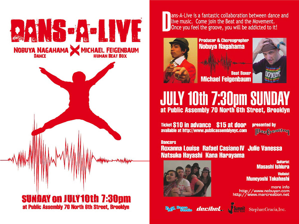 “Dans-A-Live”, a dynamic show featuring diverse dancing, singing, unique body percussion and live music, at Public Assembly (70 North 6th Street, Brooklyn, NY 11211) on Sunday, July 10 at 7:30 p.m. “Dans-A-Live” will feature the production debut of Nobuya Nagahama, a well-respected Japanese dancer and choreographer who appeared as a finalist in the hit television show, “So You Think You Can Dance?”. Cover is $10 in advance, $15 at the door.