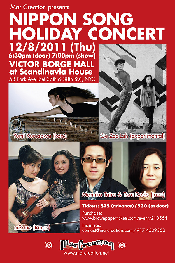 New York, NY – November 22, 2011 – Independent record label, Mar Creation, Inc. will host the “2011 Nippon Song Holiday Concert”, featuring four prominent Japanese musicians/groups, spanning the genres of jazz to tango. The dynamic concert lineup includes four award-winning musicians and groups, and a special artist reception will immediately follow the concert. The event will take place on Thursday, December 8, 2011 at 7:00 pm (doors open at 6:30 pm) at the Victor Borge Hall at Scandinavia House, 58 Park Avenue (between East 37th and 38th Streets), New York, NY, and tickets are $25 in advance ($30 at the door).